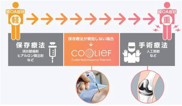 クーリーフは膝の痛みを司る神経をラジオ波で焼灼することで痛みを抑える治療であり、「保存治療」よりは直接的に痛みを抑え、「手術治療」よりは侵襲が小さい、「保存治療」と「手術治療」の間の治療です。2024年4月からは保険適用となり、徐々に普及してきている新しい治療です。