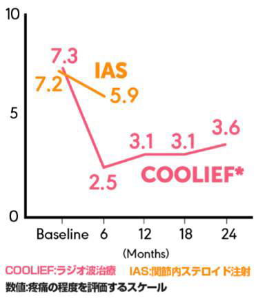 治療後6ヶ月で74%、12ヶ月後には65%の患者が疼痛が50%以上軽減を認めます。