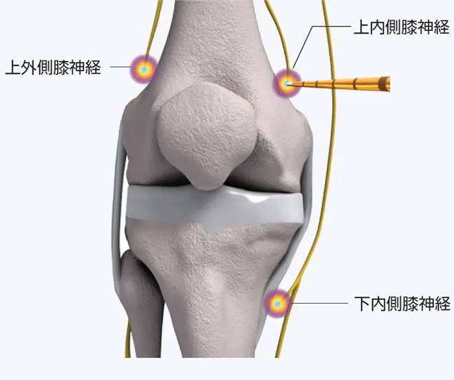 ①外来で神経にブロック注射を行い、神経を焼灼することで痛みが改善するかどうかを確認します。上外側膝神経、上内側膝神経、下内側膝神経の3か所に行います。ブロック注射で痛みが改善しない場合はクーリーフ治療を行っても痛みの改善の見込みが低いためクーリーフ治療はおすすめできません。