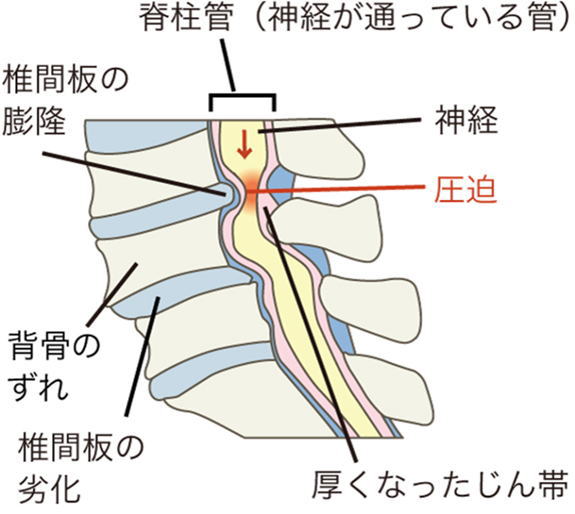 背骨は中央部が空洞で神経の通り道になっており、その空洞を脊柱管といいます。靱帯骨化や加齢による変形などによって腰の骨の脊柱管狭窄が狭くなると、神経が圧迫されて、下肢の痛みやしびれ、運動の障害が出現します。この状態を腰部脊柱管狭窄症といいます。