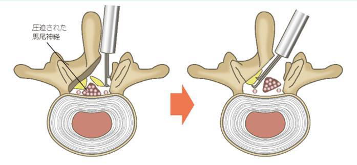 背中の皮膚を切開して、筋肉をよけて腰椎の椎弓という部分を露出させます。骨の一部を切除して、圧迫の原因となっている変性した靱帯や椎間板を切除することで神経の圧迫が改善し、神経の回復を促します。